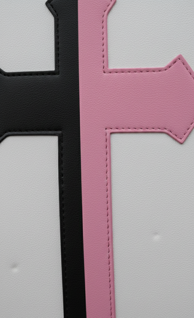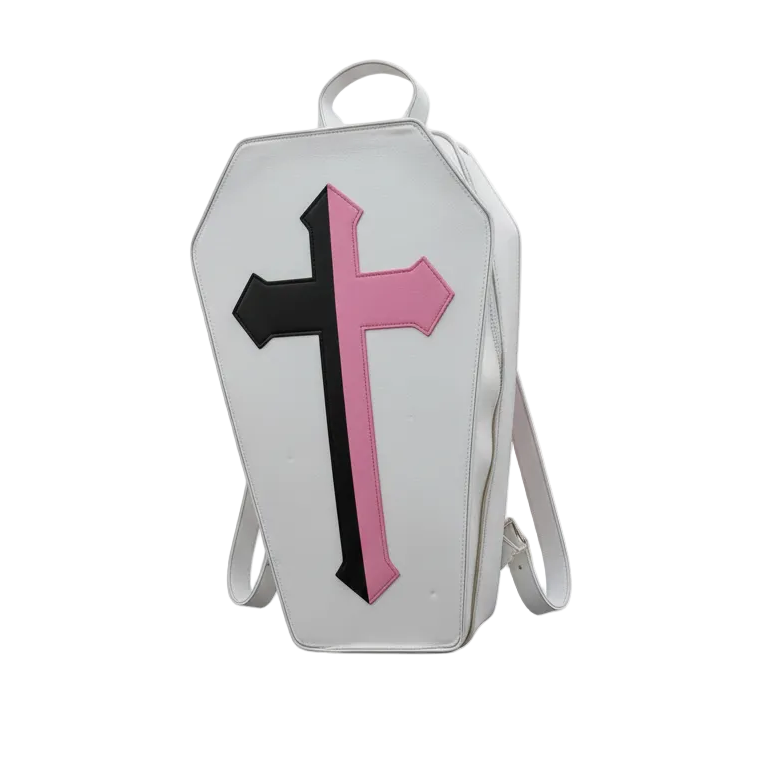 An architectural statement in gothic luxury. This signature coffin-silhouetted backpack features a tri-tone paneled exterior with a central cross appliqué. Designed as a functional reliquary for the modern underground.