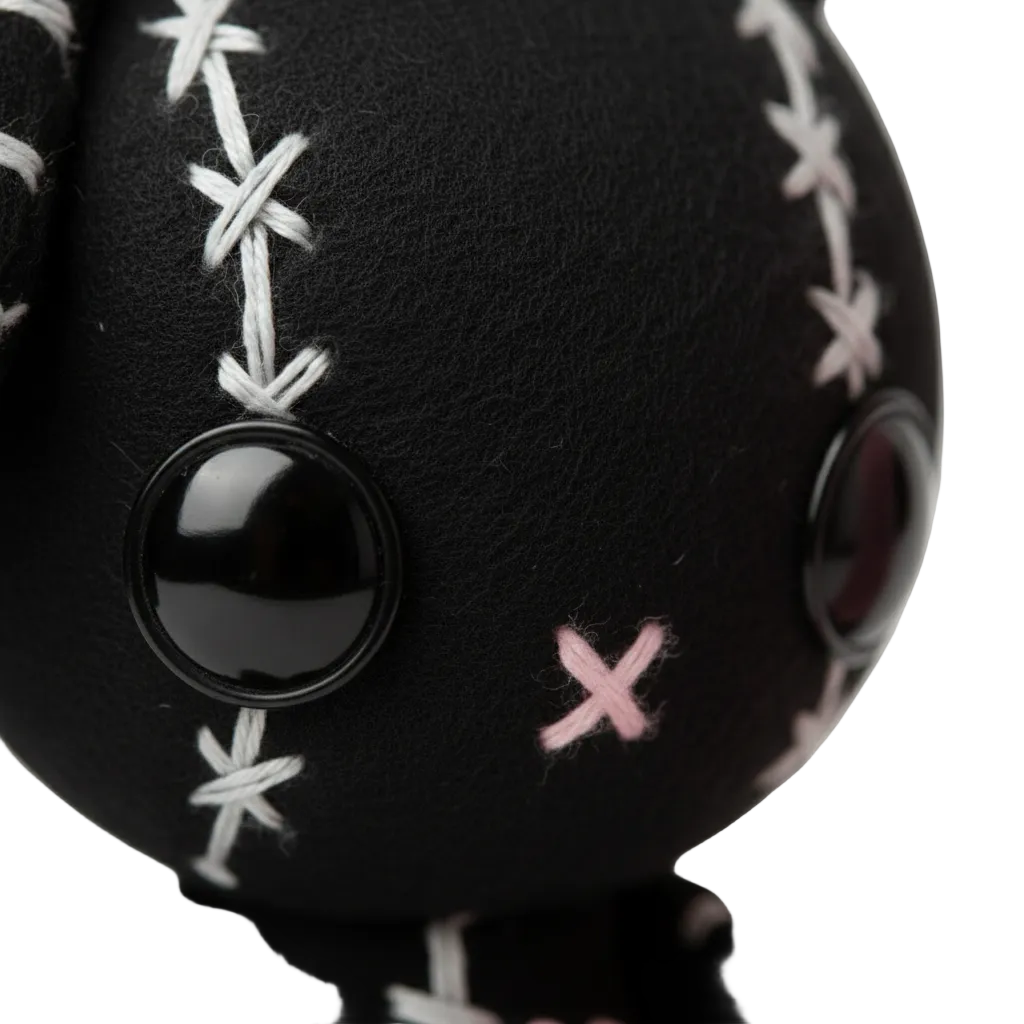 • Detail: Cross-stitch embroidery and high-gloss ocular inserts.
